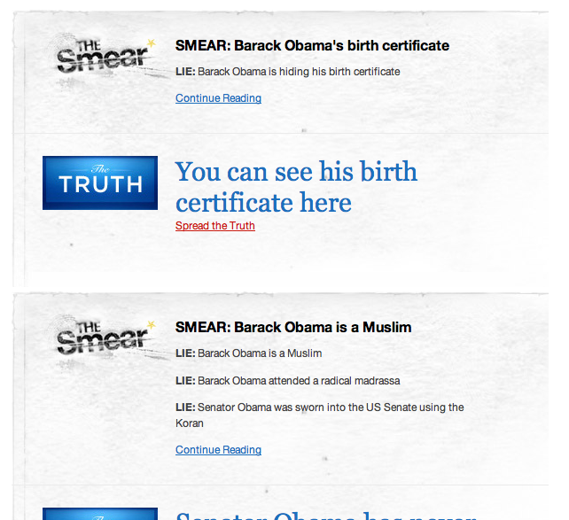 I think the Barack Obama website is amazing – one of the best on the web. The ability of the site to “brand” him as a politician is astoundingly detailed and beautiful. However, I think the recently launched Fight the Smears site could be much better. I think there are some information design issues with the the page that makes it difficult for the reader to get the message. I don’t think the problem is severe enough for the user to be confused as to confuse the fiction from the truth, but I think the page doesn’t work as a quick read, to the point where it took me a while to figure out exactly how to read the page.