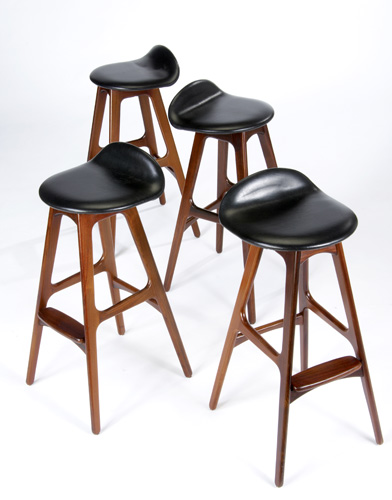 I scored a pair of rosewood stools today at a garage sale. They are attributed to Erik Buck for OD Mobler also known as Oddense Maskinsnedkeri. They are seen in teak and rosewood, these are richly grained rosewood. A little wear along the legs and footrest, but nothing a little linseed oil can’t make look good as new. The leather is in perfect condition.