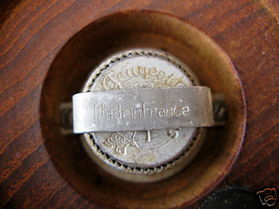 Ah, excellent topic, Mark. There seem to be only three variations I’ve seen in the bands of the early Peugeot grinder. I’ve only seen a dozen or twenty over the last year, and those are about equal. There’s “Made in France”, as pictured above, but there’s also “Peugeot Fs” (I’m assuming — the fancy script is hard to read) as well as a version of the Peugeot Lion symbol plus “Lyon.”