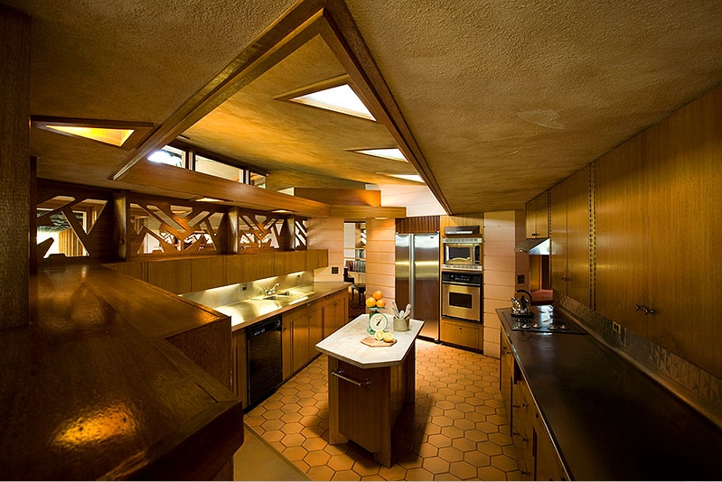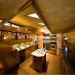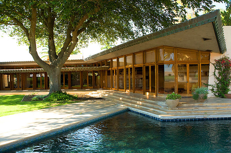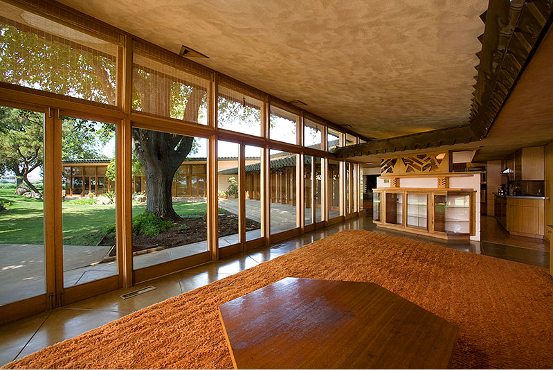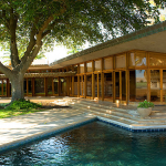 An amazing Frank Lloyd Wright home is for sale in central California, near Los Banos. It was designed in 1954 and contstruction finalized in 1961.  I highly recommend checking out the site – the photos are amazing.  Just look at those details.  The glass!  The wood!  The tiles!  The pool!  Every inch of the interior and exterior looks like it was thought through by FLW himself.  Awesome.  The Fawcett Ranch House.