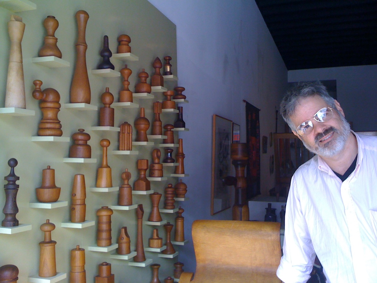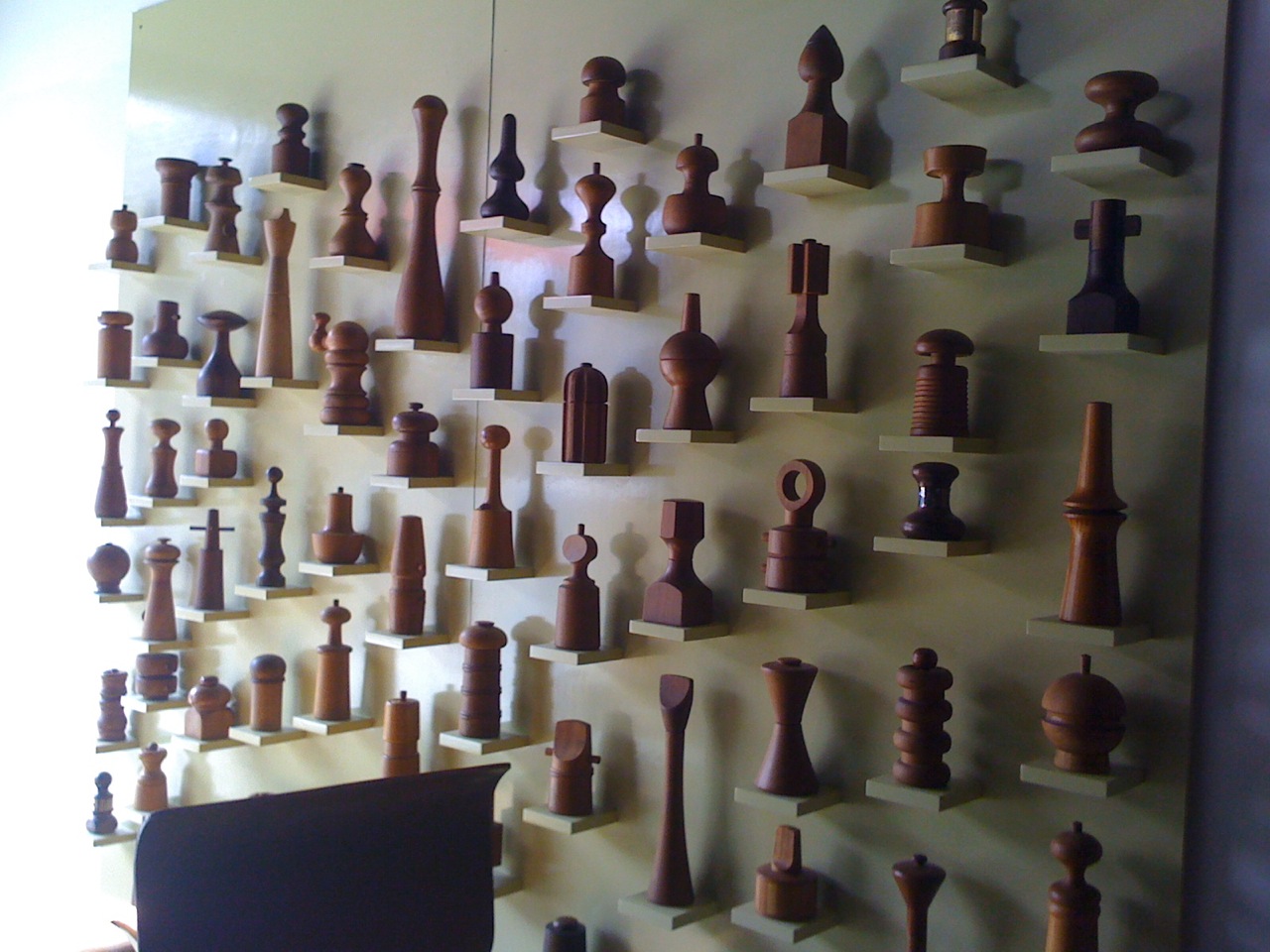 First of all, the collection. If both of my cameras hadn’t broken before my trip, I’d have better photos, but the iPhone did a good job. You can see from the photos that the collection is quite extensive. He’s got a great selection of Jens Quistgaard for Dansk mills as well as those by other designers. As I wrote about in my previous post, he’s got some very rare mills that are highly sought after by serious collectors, some I’ve never seen in person and it was great to be able to hold them in my hand. They are also displayed beautifully. Each mill sits on it’s own little shelf on the 8’x8′ wall, painted cream or ecru color to offset the mills’ wood. It’s a display Sam himself designed and had built for the collection. And of course, the whole thing is for sale…