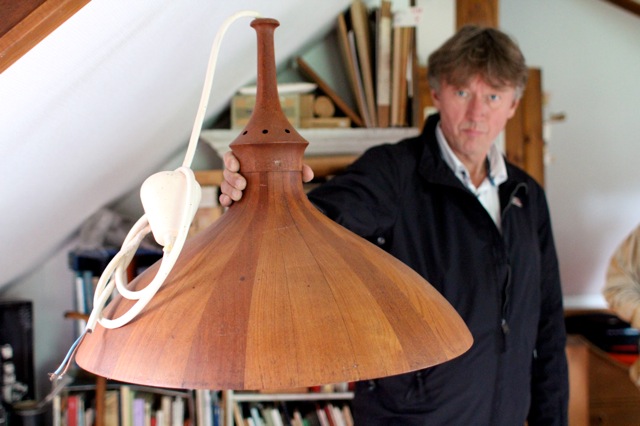Here’s an amazing piece being modeled by Stig. It is a super rare staved teak light fixture that was hanging in one his homes at some point. The inside was lined with metal, and it was clear that a lot of hand-work had gone into it.