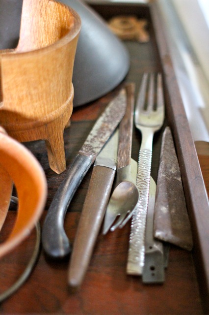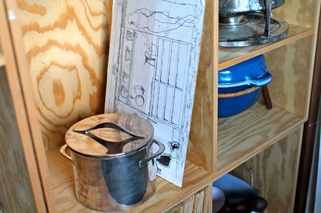 Next to the workshop is the archive. This is a small room with plywood shelving that is stacked to the ceiling with rare and common pieces mixed in with one-of-a-kind prototypes. It was a collector’s dream. There are reams of drawings, prototypes, correspondence, and books. I could have spent a lot more time there. Seen here are just a few of the treasures. That’s a (solid?) silver version of his early 60s line of copper cookware. Behind it is a hand-drawn rendering of his kitchen. I don’t know if he drew it as a still life of the kitchen or if it was drawn as a plan before its construction, but I do know that his cook was pretty good looking. There is more enamel, both early and late in the background. There was also rare pottery and a lot of unusual teak pieces that never went into production to be found up here, including some very strangely shaped bowls, a round knife rack filled with hand made knives, and unique ice buckets.