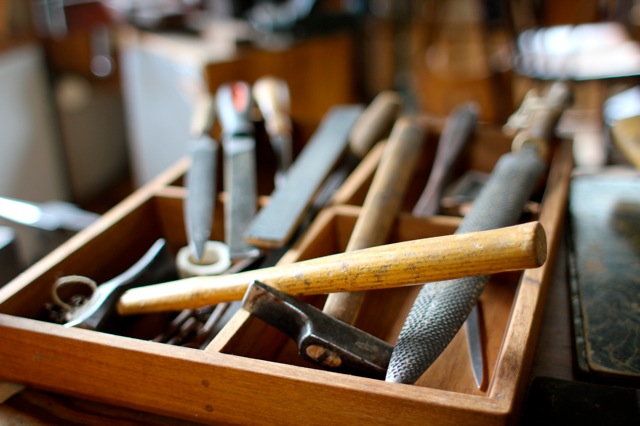 The tools! No CAD software here. Just a sketchbook and a bunch of well-worn tools to cut, carve, and shape metal and wood. It seemed like the workshop was mainly focused on metal work, although he could do light wood work as well. It wasn’t a full-on furniture making shop at all – it was very small. He would draw his pieces and have them prototyped outside. But it is clear he did a lot of creative work there.